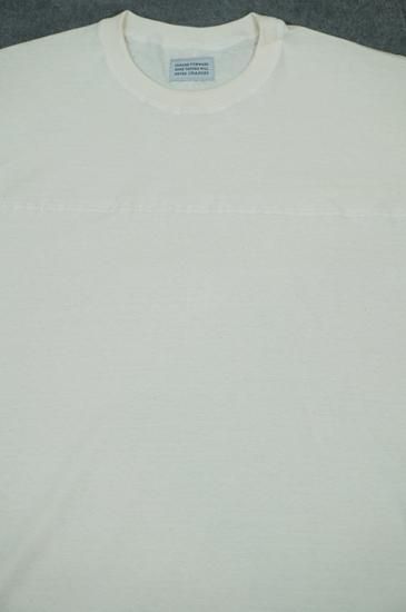 ゆとりのある落ち感のあるシルエット。フットボールTEEならではの切り替えデザインをアレンジし、前、後の切り替え線を袖先で繋げたディテールが特徴的です。カジュアルな印象のフットボールTEEを素材と切り替えにこだわり上品に仕上げた一着です。