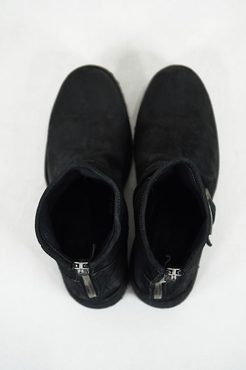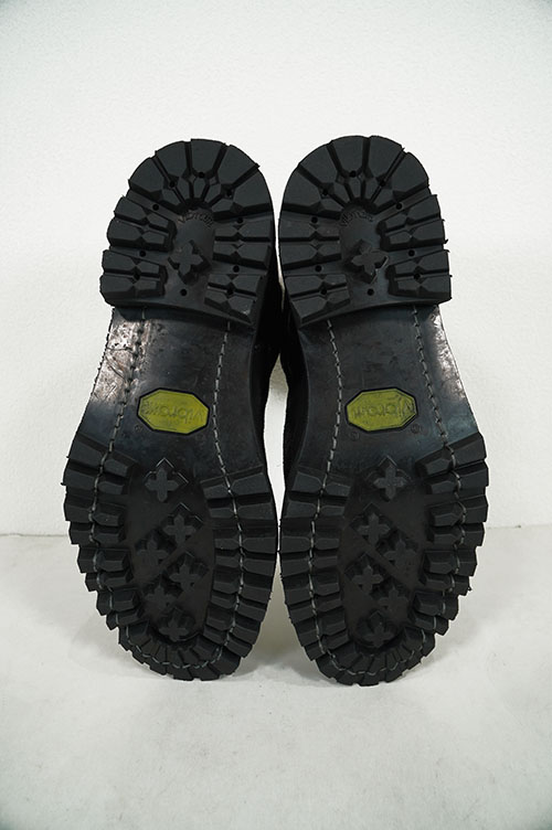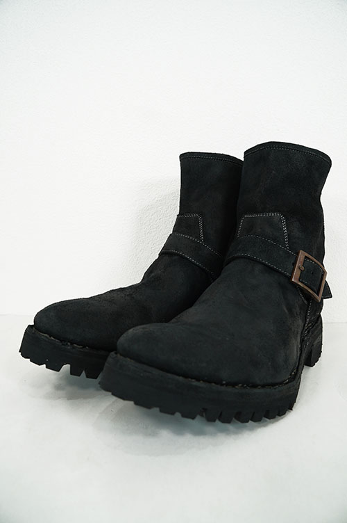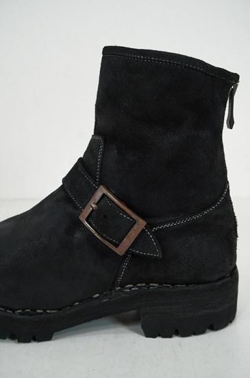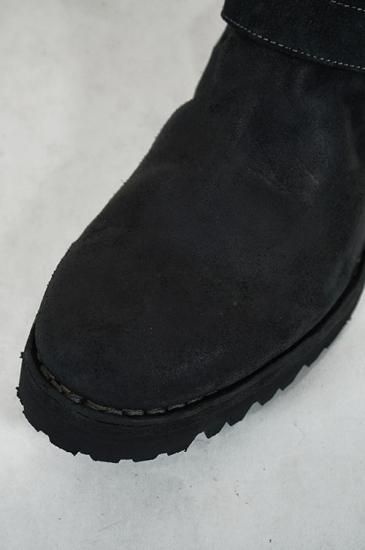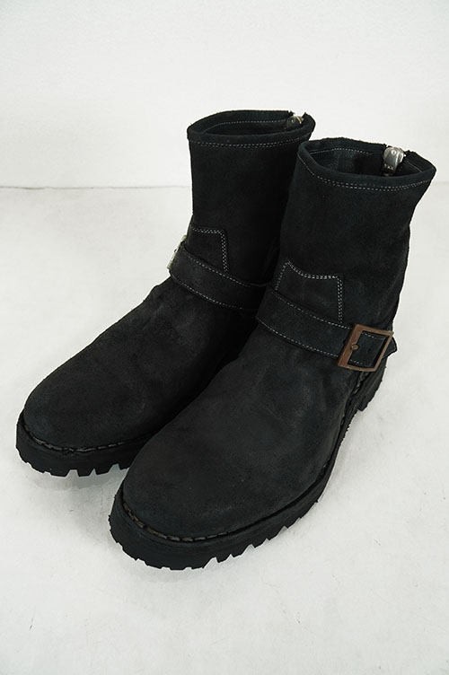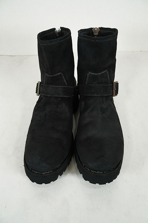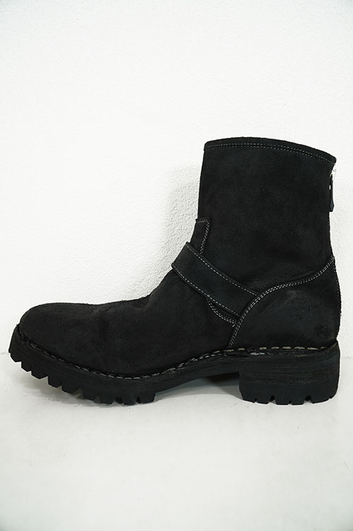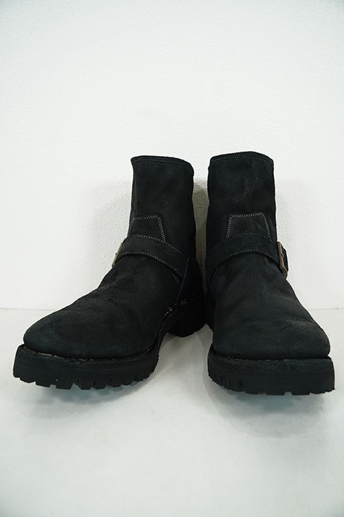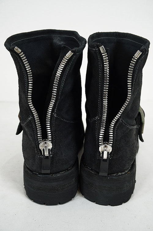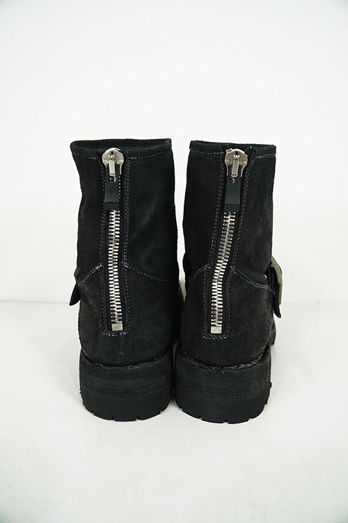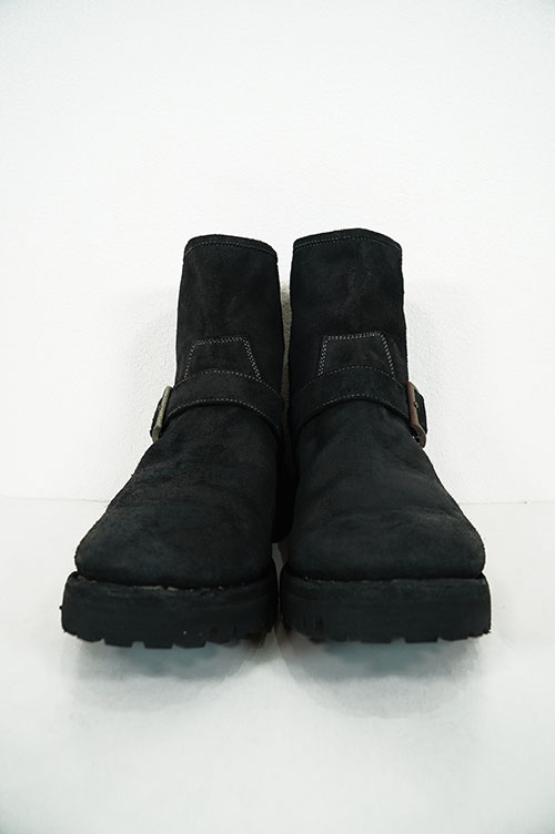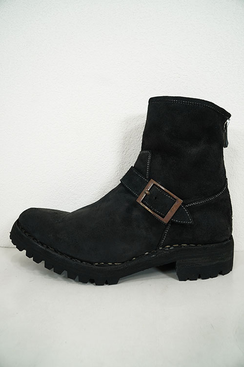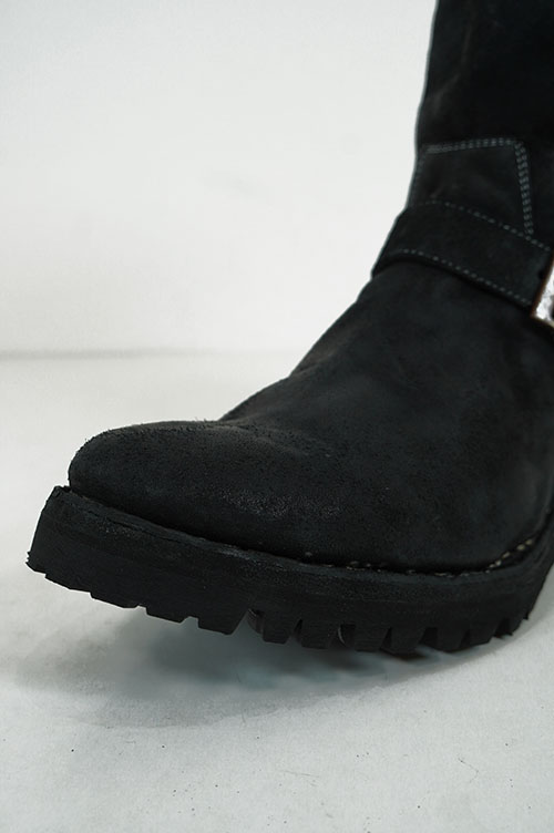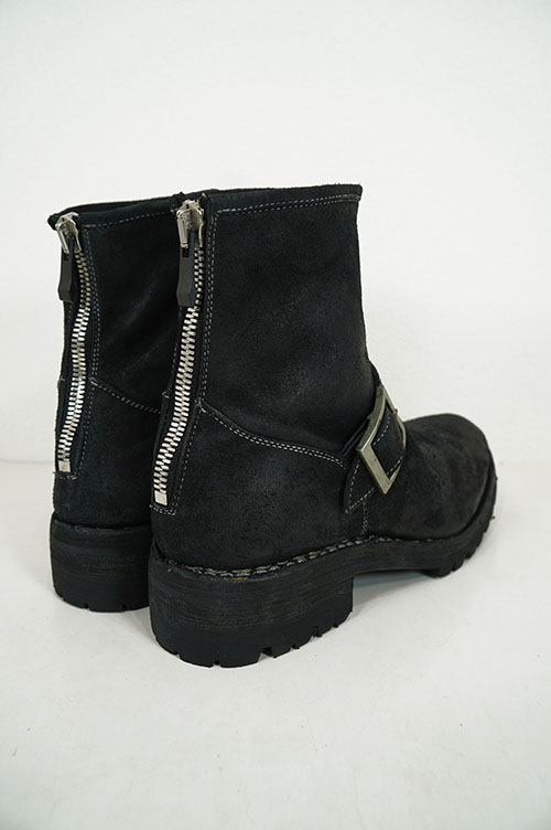 バックファスナーを付けシャフトを細くシャープな印象のエンジニアブーツに仕上げました。 グッドイヤーウェルト製法によりクッション性のある履き心地。製品染めとヴィブラムソールの仕様により迫力があるブーツになっています。立体的に入った履きジワは手作業によるもの。