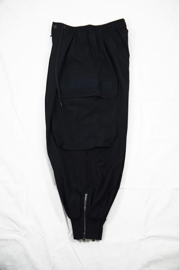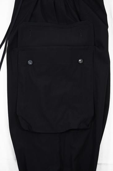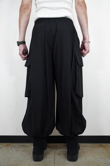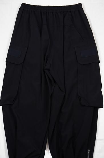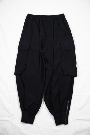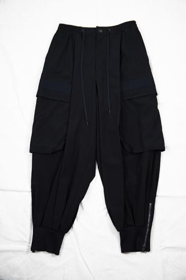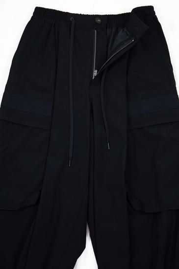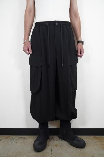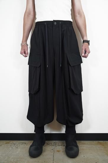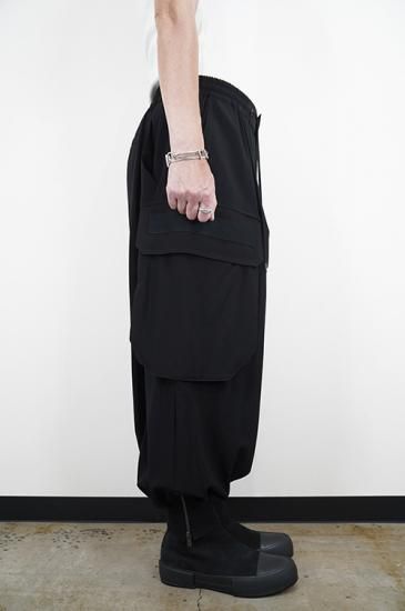 ウール産地である尾州地区で制作されたウール100%。春から秋口まで幅広く対応可能な素材で製作しています。 デザインは新型となる立体カーゴポケットが特徴のワイドカーゴパンツ。生地を贅沢に使い、全体的にボリュームを持たせた迫力のあるシルエットです。裾のリブに向かって緩やかにテーパードをかけ、さらに裾部分にもタックを入れることで、生地のボリュームを活かした立体的で丸みのあるフォルムを形成。ウエストはゴムとドローコードのイージー仕様で、リラックス感があります。