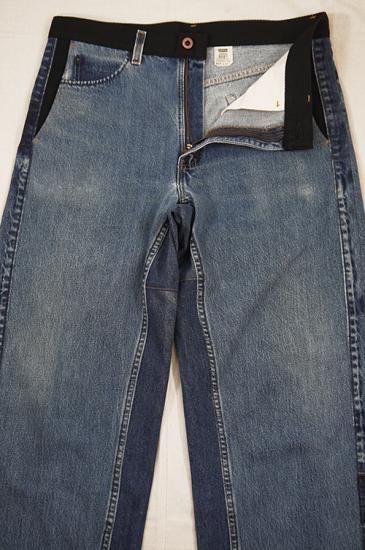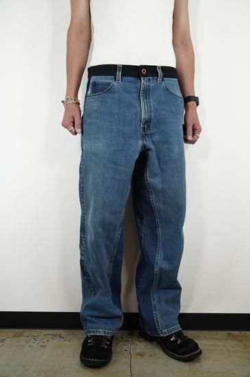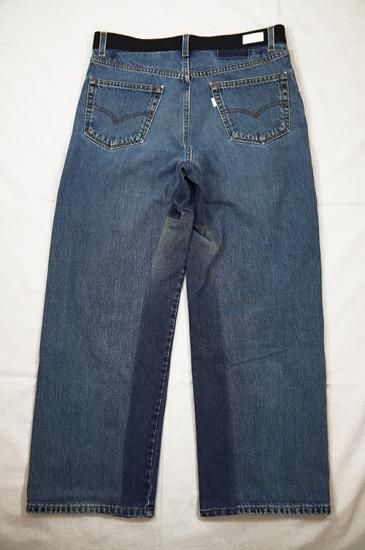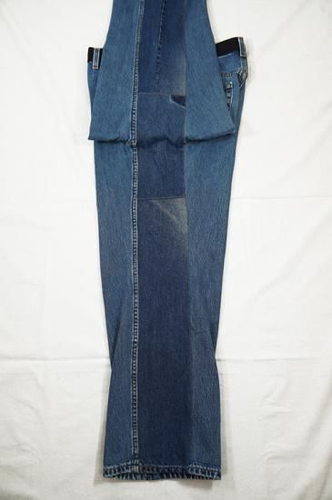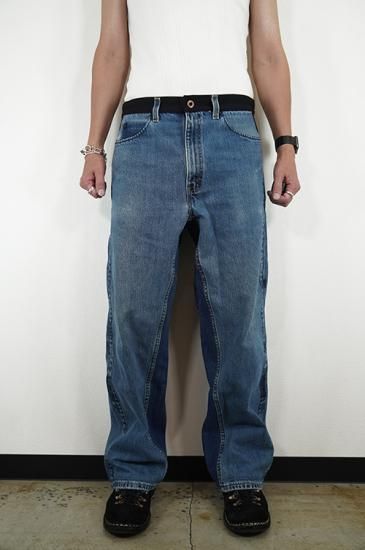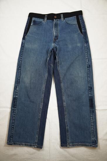 USEDのデニムパンツを解体し再構築。腰周りベルト位置の生地をサイドラインに移植、腰周りとポケット口にブラックの刺し子デニムを配置。通常のデニム5ポケットをスラッシュポケットに縫い直し4ポケットにしています。股部分に濃色のデニム生地を足しワイドパンツにシルエット変更。刺し子生地も洗いと穿き込むと色落ちが楽しめます。