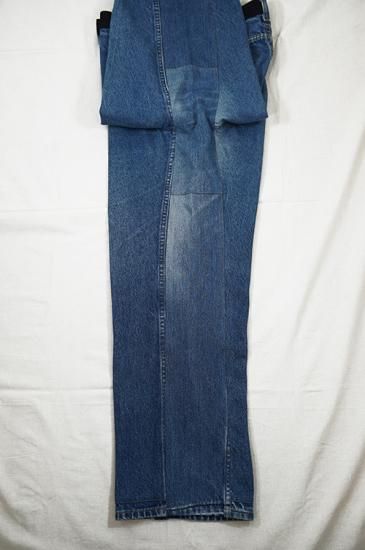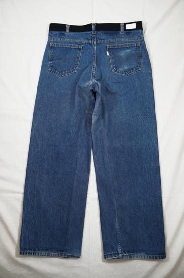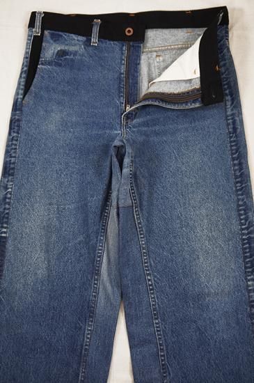 USEDのデニムパンツを解体し再構築。腰周りベルト位置の生地をサイドラインに移植、腰周りとポケット口にブラックの刺し子デニムを配置。通常のデニム5ポケットをスラッシュポケットに縫い直し4ポケットにしています。股部分に濃色のデニム生地を足しワイドパンツにシルエット変更。刺し子生地も洗いと穿き込むと色落ちが楽しめます。