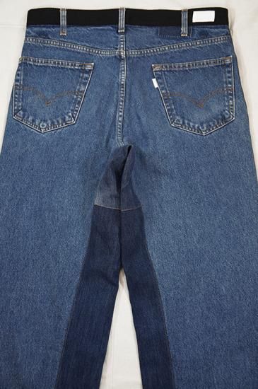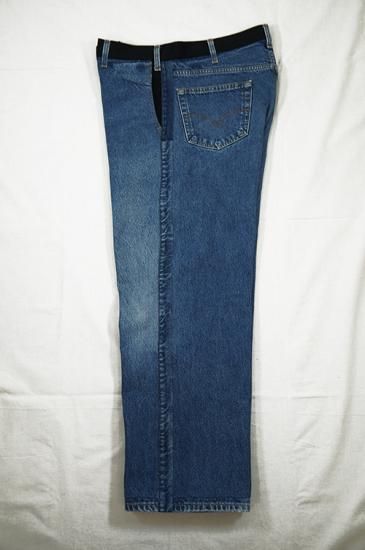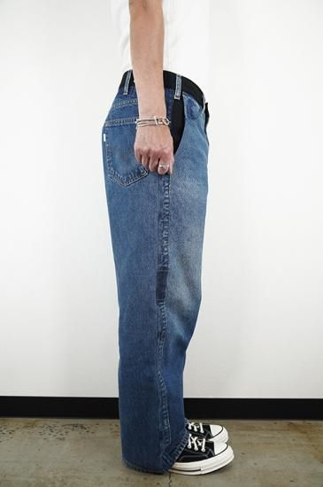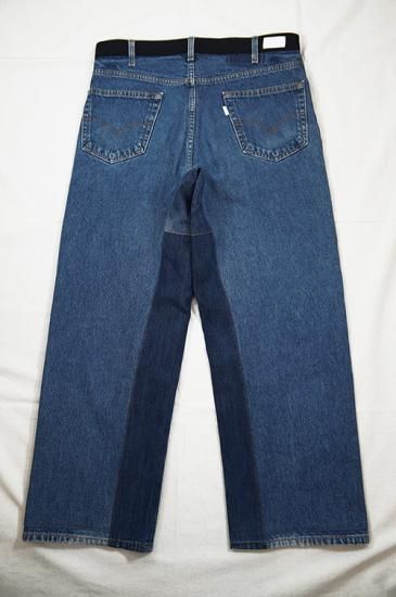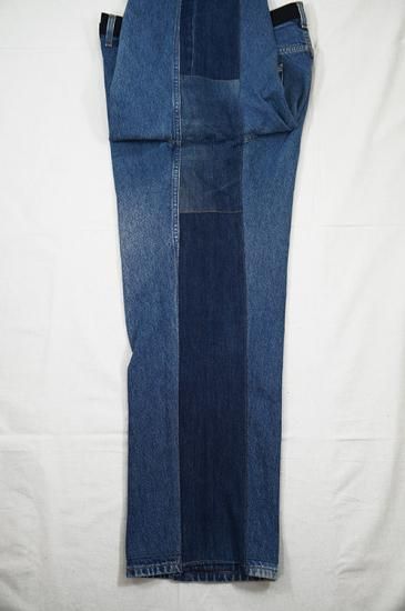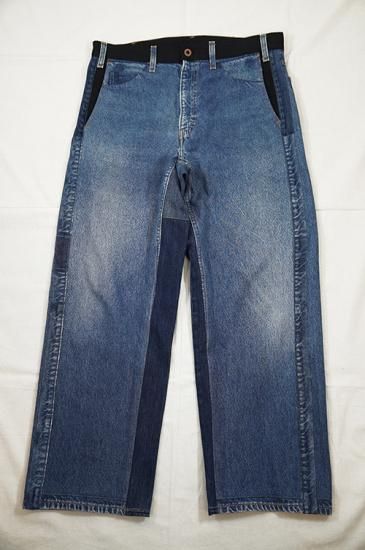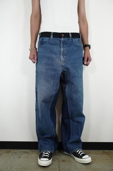 USEDのデニムパンツを解体し再構築。腰周りベルト位置の生地をサイドラインに移植、腰周りとポケット口にブラックの刺し子デニムを配置。通常のデニム5ポケットをスラッシュポケットに縫い直し4ポケットにしています。股部分に濃色のデニム生地を足しワイドパンツにシルエット変更。刺し子生地も洗いと穿き込むと色落ちが楽しめます。