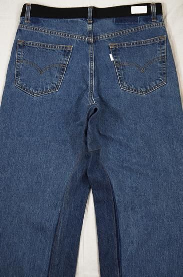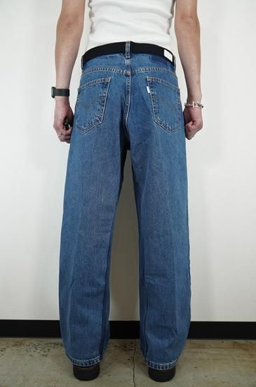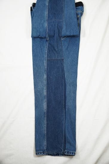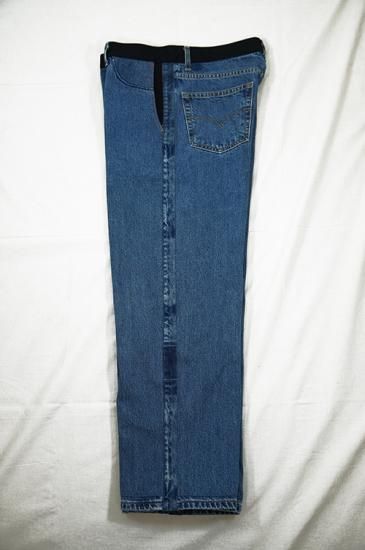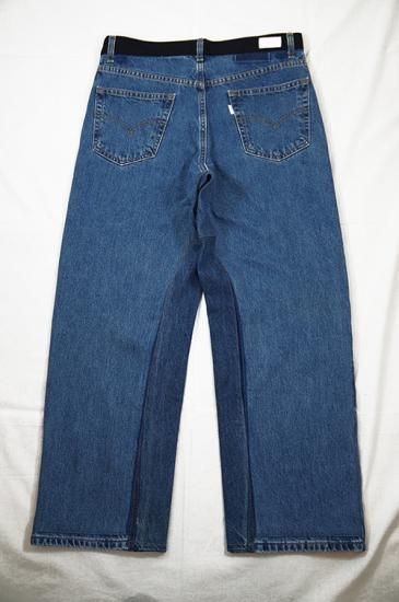 USEDのデニムパンツを解体し再構築。腰周りベルト位置の生地をサイドラインに移植、腰周りとポケット口にブラックの刺し子デニムを配置。通常のデニム5ポケットをスラッシュポケットに縫い直し4ポケットにしています。股部分に濃色のデニム生地を足しワイドパンツにシルエット変更。刺し子生地も洗いと穿き込むと色落ちが楽しめます。