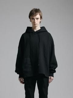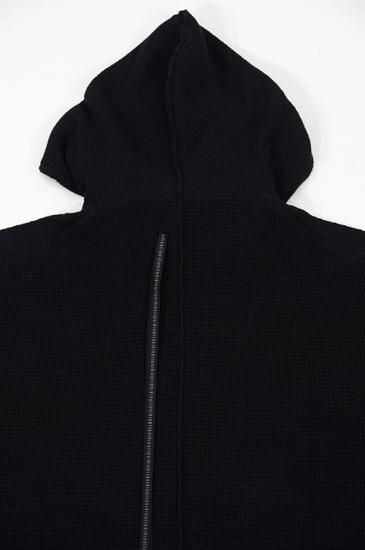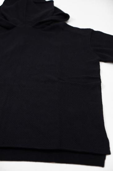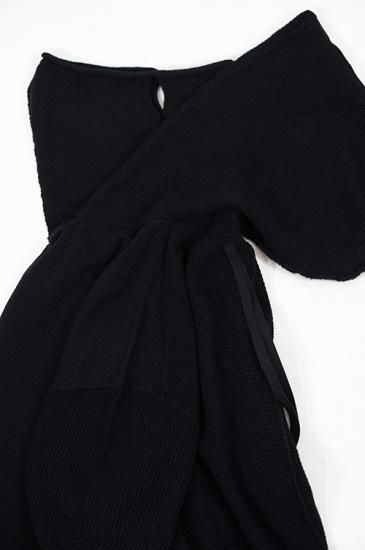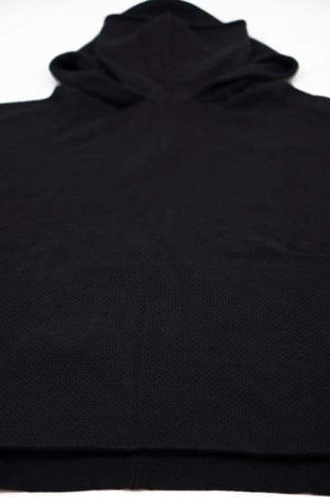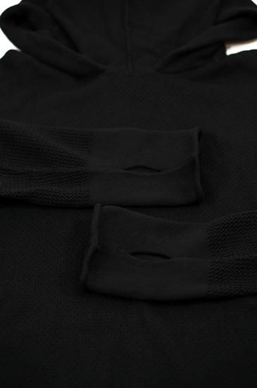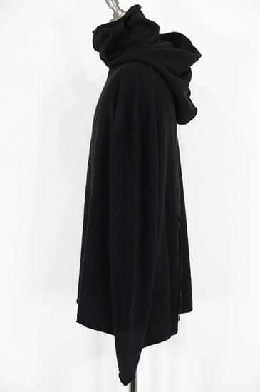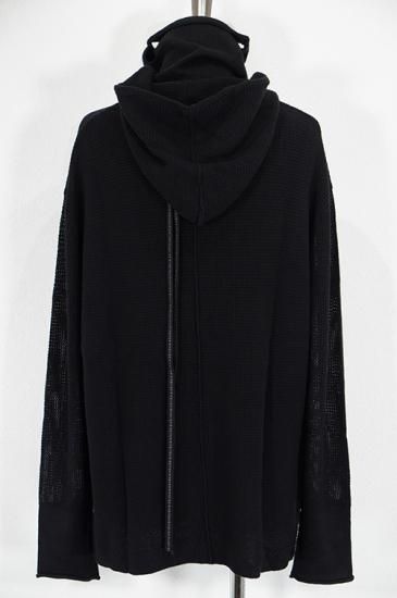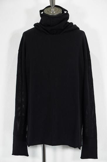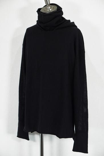 コットンカシミヤのマスク(ネックウォーマー)が付いたニットソー。薄手で柔らかい肌触り。袖は編み地を変えメッシュに。モード感のあるニットになっています。