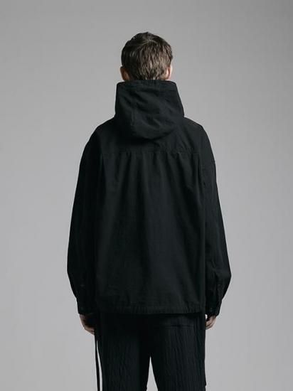 高密度のダウンプルーフを使用したリラックスフィットのフーデッドシャツ。 斜めに開く変形パターン、裾にドローコードを配置しています。 縫製した後にボールバイオウォッシュを施しています。
