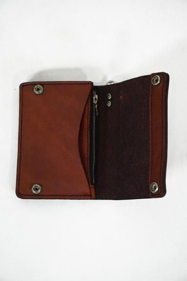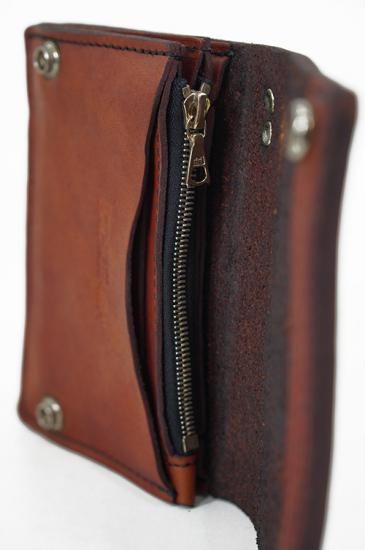BACKLASHを代表するダブルショルダーに製品染めを施したトラッカーウォレット。