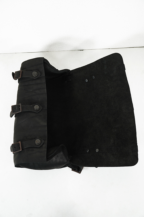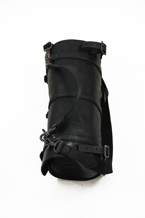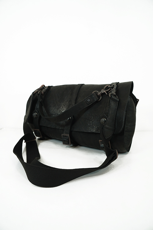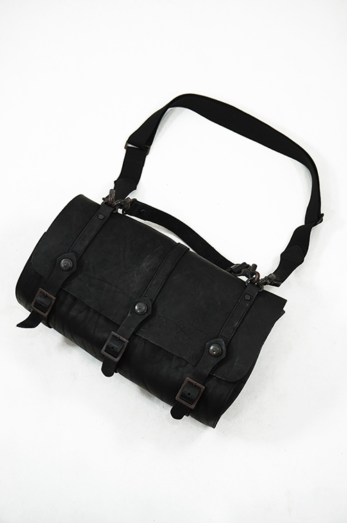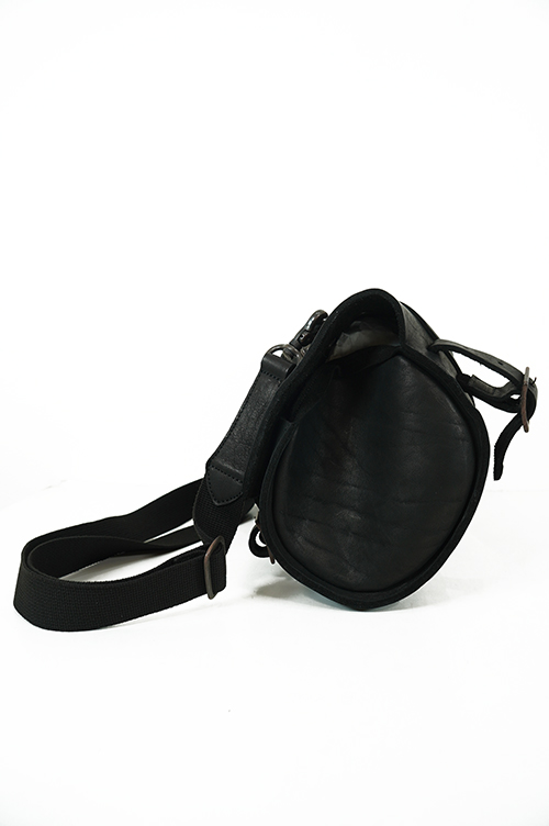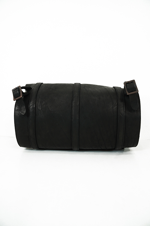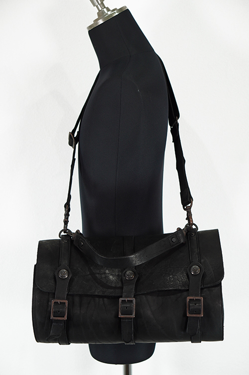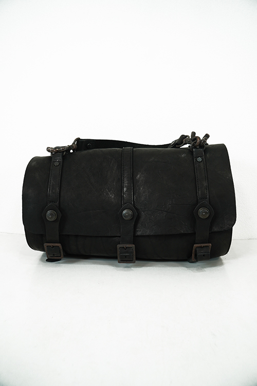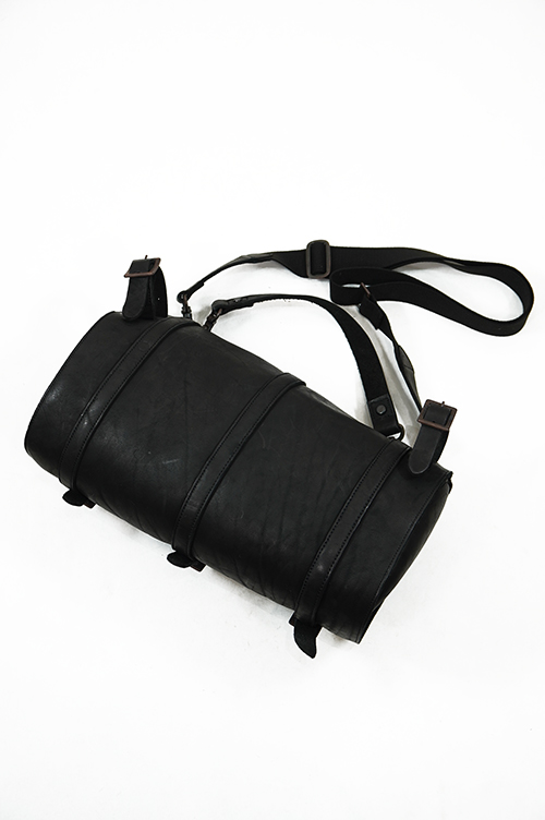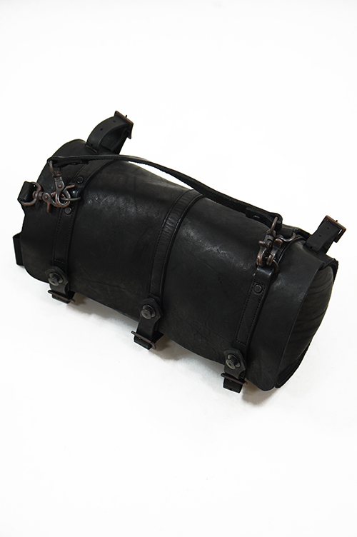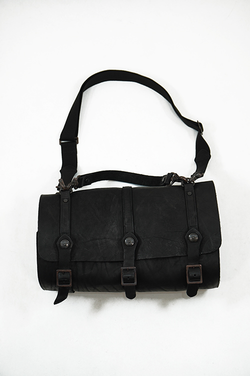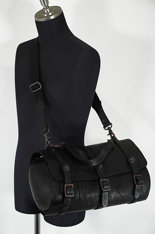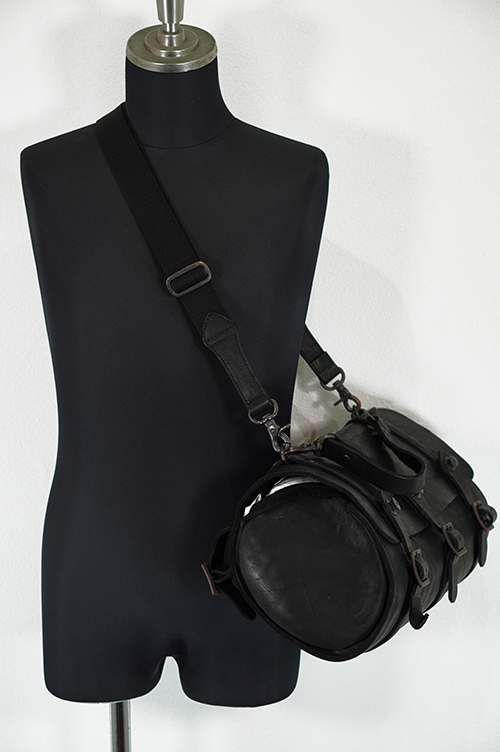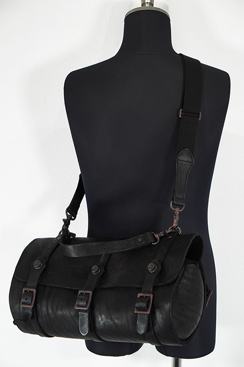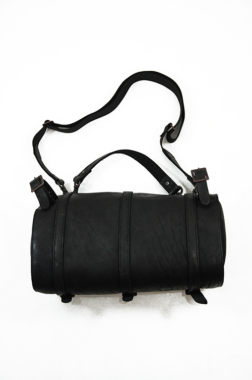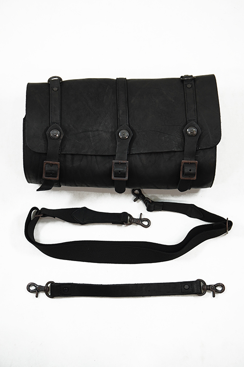 BACKLASHを代表するフルタンニン鞣しのダブルショルダーに製品染めを施した筒型バッグ。バイクに付けるように固定ベルト付きになりますが、バイク以外にもショルダーベルトと手持ちのストラップが付いた3WAY仕様。
