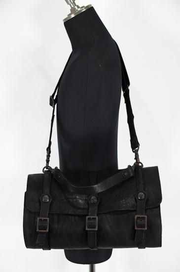 製品染色加工のダブルショルダーレザーがオーラを放つ、存在感のあるバッグになっています。