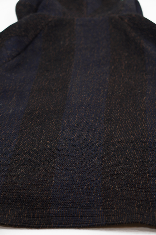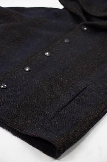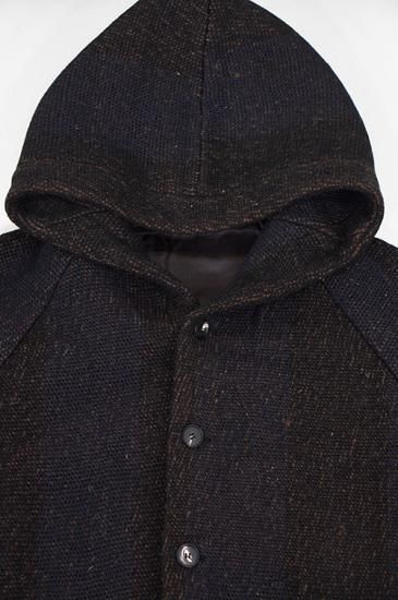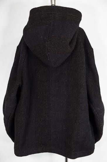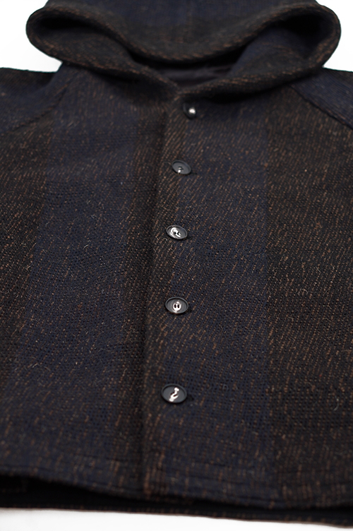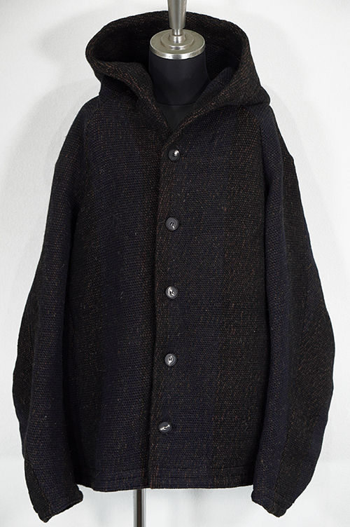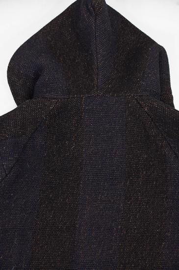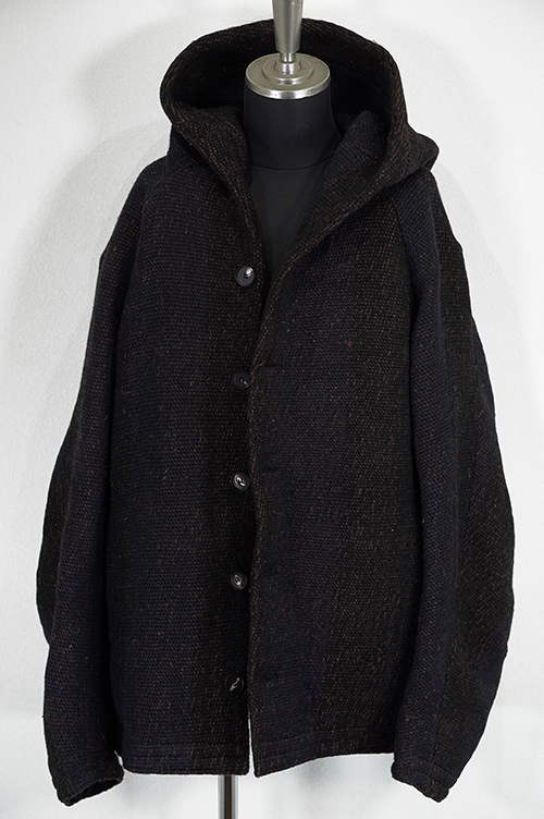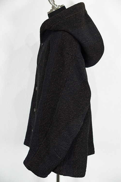 素材はインドで手織りによって製作されています。迫力のある雰囲気と手織りの温もりが伝わる素材に仕上がっています。パターンはゆったりとしたフードジャケットパターンを設計しています。
