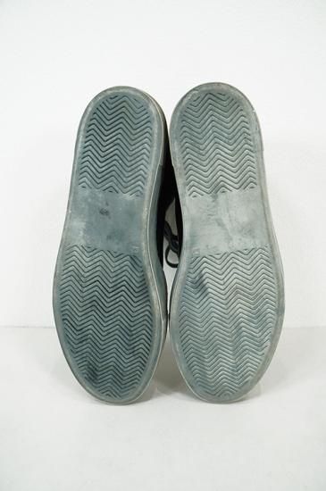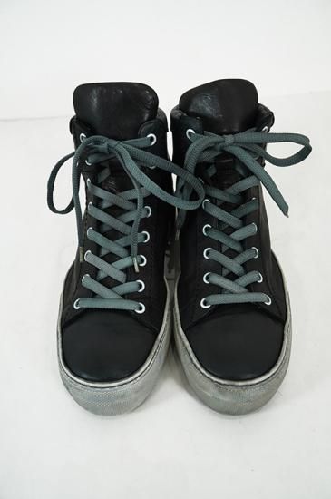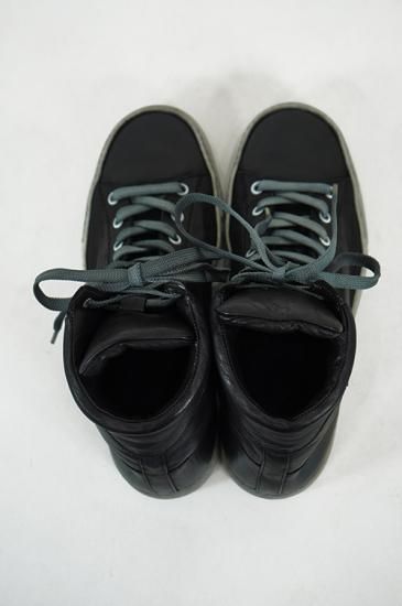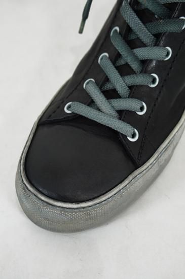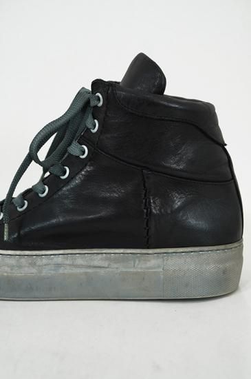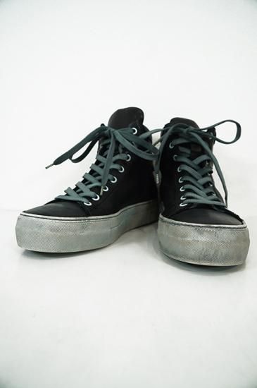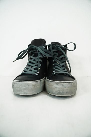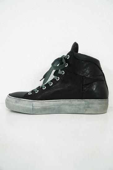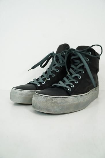 ボリュームがある厚めソールを用いたハイカットスニーカー。サイドにはオーバーロックステッチを施しています。製品染めの為、ソール、靴紐も染まり共通の風合いを持っています。 クラッシックなデザインが魅力の一足です。