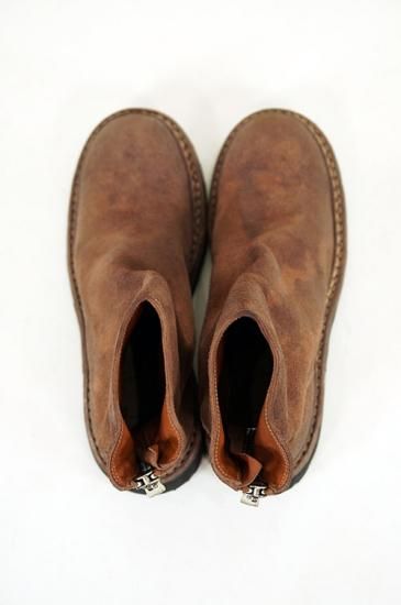 アンクル丈のバックジップショートブーツ。上質なホースフルグレインレザーの下地を用い染色されています。
