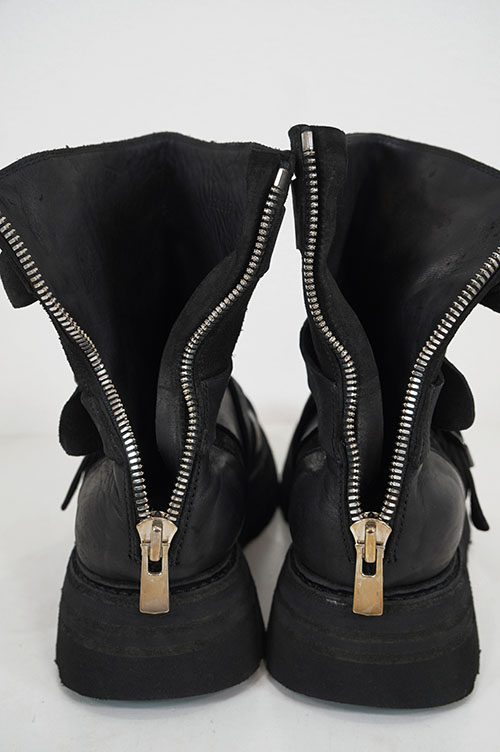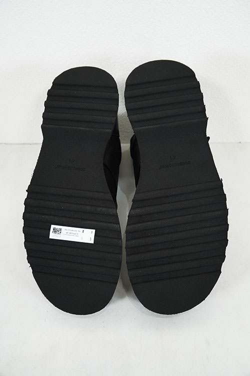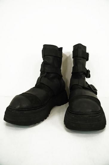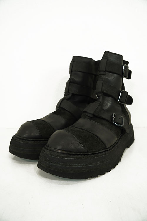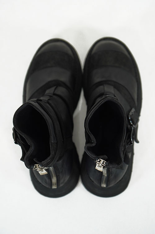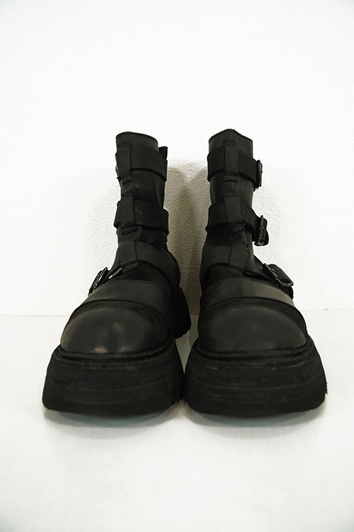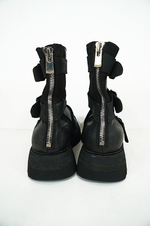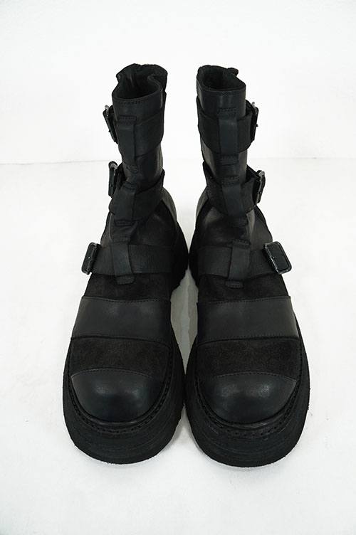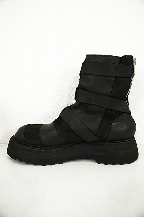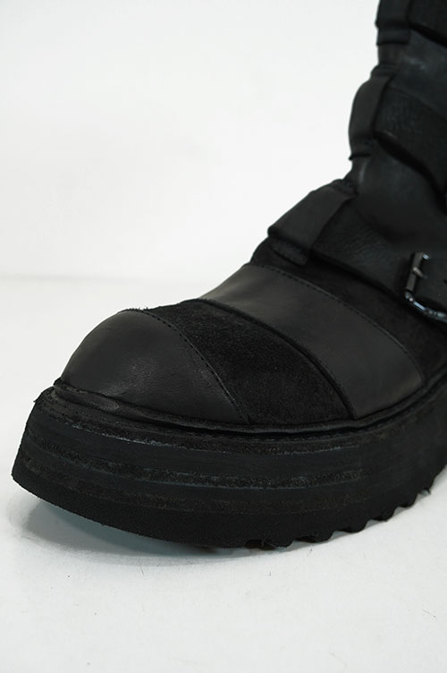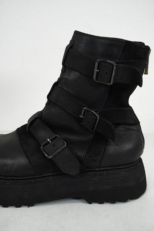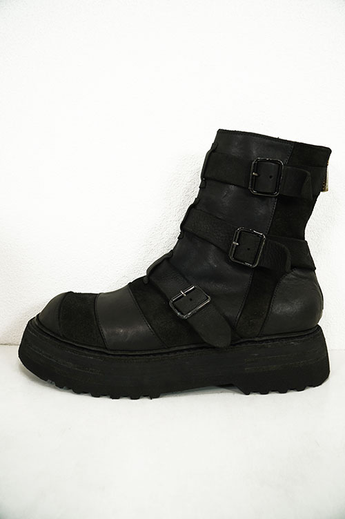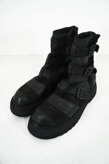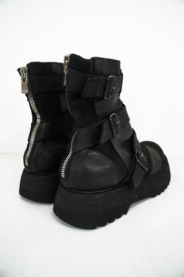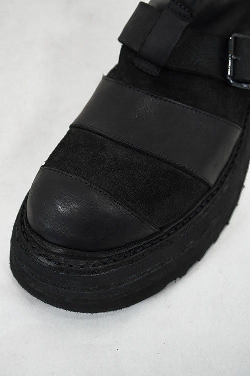 表革とスエードをパッチワーク状にしベルトを付けたモード感のある一足。ベルトを通すバックルは艶があるブラックですが、タンブラーダイの擦れによりところどころ表面の塗装が剥がれている仕様。厚みがあるソールも特徴です。バックジップを付ける事で着脱のしやすさも考慮したモデル。