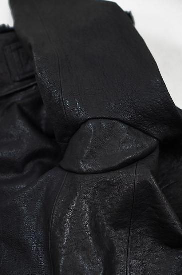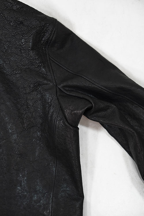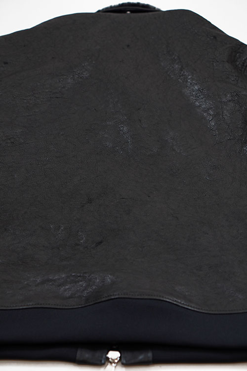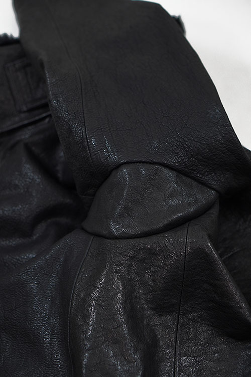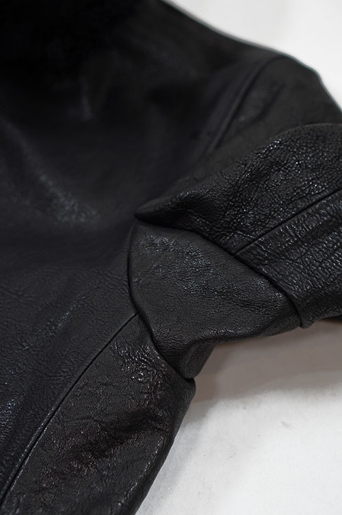 フルタンニンである、見た目も骨っぽさがありますが、オイルを多く含ませる事で、弾力としなやかさを持たせ、着心地も重視したレザーです。脇にはマチを入れ可動域を上げているのも着やすくしている特徴です。