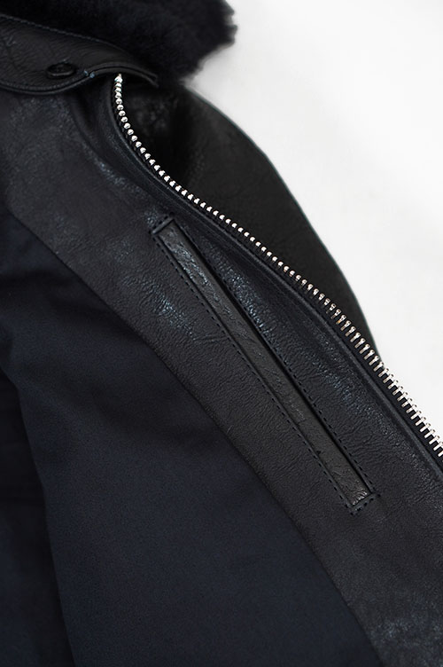 取り外し可能な、ムートン襟が付いたG-1ジャケット。スナップボタン付きのベルトが付いているので立ち襟にする事で防風性を高められます。ファスナーポケットの下位置に横から入れられるポケットを配置。デザイン性と実用性を兼ね備えています。左見頃裏に内ポケット付き。こちらもあると便利なポケット。