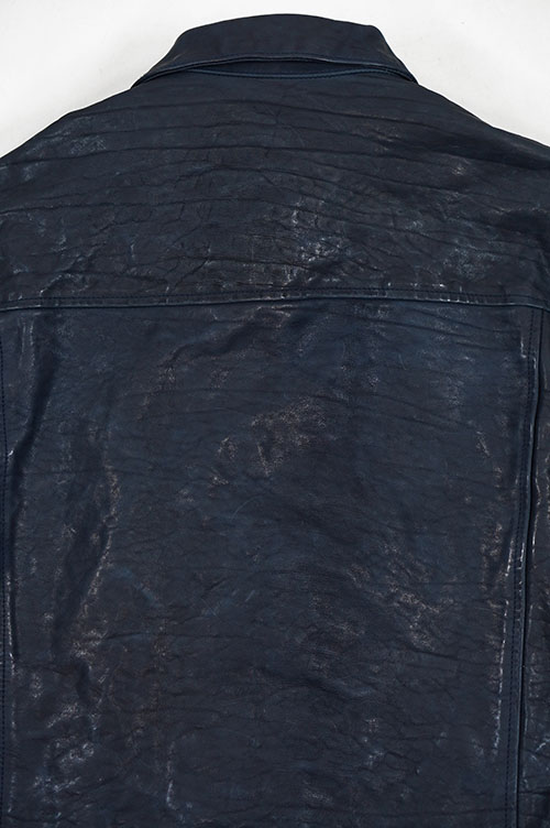 ヴィンテージと称されるイタリアン産ダブルショルダーレザーを採用。ブランドを代表する製品染色によるものとは異なり、革の状態で染色を施すことで、より一層深い色彩の革に。オイルを染み込ませた下地をベースに、表面にワックスをかけ高圧プレスを用いることにより他の革とは異なる独特なトラの強い表情を生み出しつつも、製品元より艶やかな質感を実現することで、独自の異なる二面性を併せ持っています。更にプルアップ加工を施すことにより重厚感のある濃淡を強く形成しています。さらにジャケットとして製品の状態を構築した後に、仕上げとして製品洗いを施すことで皺感のある熟れた風合いを演出しています。ハードな印象を放つ見た目とは裏腹に、非常に扱いやすく手馴染み、着馴染みの良い質感に特化したシリーズです。